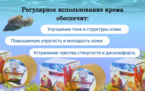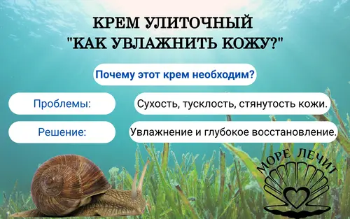 Крем улиточный "Как увлажнить кожу?" серия "Море Лечит". Крем, содержащий муцин улитки ахатины и экстракт диктиоты, прекрасно увлажняет кожу, устраняя сухость, возникающую вследствие неправильного ухода, низкой влажности окружающей среды, а также воздействия природных факторов — ветра, солнечных лучей и холода. |